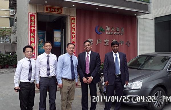 在海因特公司總經(jīng)理楊勇博士、技術(shù)營(yíng)銷(xiāo)副總監董秋芬和經(jīng)理巨鵬的陪同下,K. Nagaraj Naidu一行先后參觀(guān)了海大集團畜牧水產(chǎn)研究中心和客戶(hù)交流體驗中心。研究中心的大型精密儀器、客戶(hù)體驗中心的眾多榮譽(yù)獎牌、參觀(guān)走廊中印刷精美、排列有序的海大歷程簡(jiǎn)介讓K. Nagaraj Naidu一行贊嘆不已。董秋芬詳細介紹了海大集團的基本情況、海因特的國際化發(fā)展規劃以及與印度同行的交流經(jīng)歷等。海大集團的快速發(fā)展和專(zhuān)業(yè)實(shí)力給K. Nagaraj Naidu一行留下了深刻印象。