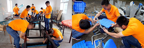 所有的捐贈物品,均由海因特團隊親自組裝。為了保證質(zhì)量的同時(shí),更加高效,所有團隊成員分成了餐桌組、書(shū)架組、桌子組、椅子組、貼膜組??此坪?jiǎn)單的一張桌子、椅子,是由許多零件用一個(gè)個(gè)小螺絲連接起來(lái)的。在整個(gè)組裝過(guò)程中,海因特團隊分工協(xié)作、細化流程、注重細節、保障效率,增強了團隊合作和溝通的能力。天非常悶熱,經(jīng)過(guò)三四個(gè)小時(shí)的作業(yè),終于完成了所有的設施安裝。團隊成員雖然汗流浹背,但非常有成就感和使命感,能夠為留守兒童送上溫暖,再苦再累也不怕。