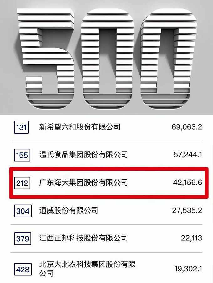 ↑↑7月10日,財富中文網(wǎng)發(fā)布了2019《財富》中國500強排行榜,海大集團以總營(yíng)業(yè)收入421.6億元榮登榜單第212位,較去年233位排名靠前了21位。