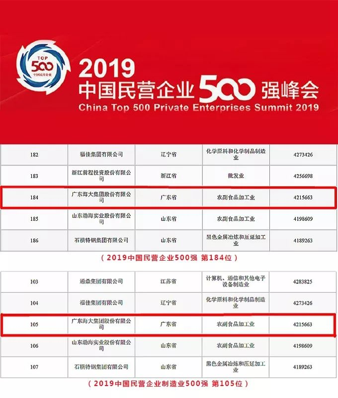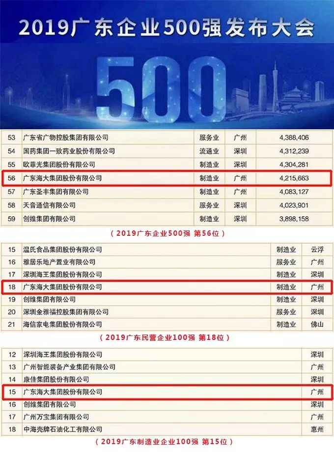↑↑8月29日上午,廣東省企業(yè)聯(lián)合會(huì )、廣東省企業(yè)家協(xié)會(huì )發(fā)布了2019廣東企業(yè)500強榜單海大集團榮登三大榜單:2019廣東企業(yè)500強第56位、民營(yíng)企業(yè)100強第18位、制造業(yè)企業(yè)100強第15位,成為本次盛會(huì )的大贏(yíng)家。