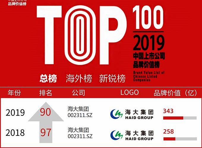↑↑5月10日,由清華大學(xué)經(jīng)濟管理學(xué)院中國企業(yè)研究中心、每經(jīng)智庫聯(lián)合研究,每日經(jīng)濟新聞出品發(fā)布的“2019 中國上市公司品牌價(jià)值榜”正式揭曉。海大集團與騰訊控股、阿里巴巴等企業(yè)共同上榜“2019中國上市公司品牌價(jià)值榜”總榜TOP100,排名90位,品牌價(jià)值343億元,相比2018年名次提升了7位,品牌價(jià)值增長(cháng)30%,在農牧行業(yè)排名僅次于溫氏股份和新希望,排名第三。