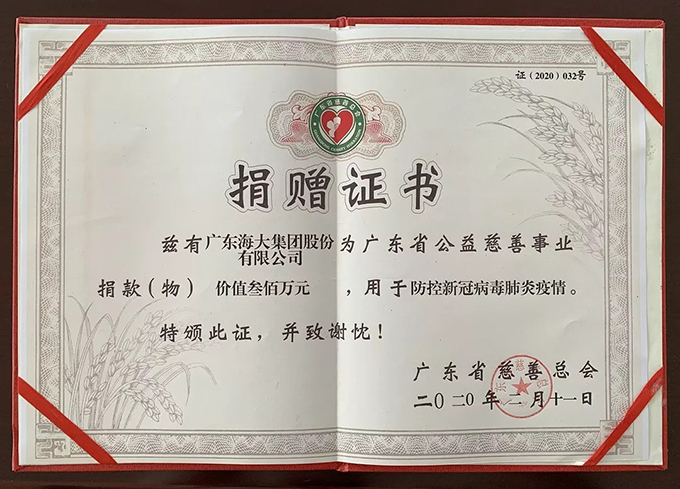 連日來(lái),新型冠狀病毒感染的肺炎疫情發(fā)展形勢嚴峻,持續成為全國人民聚焦的頭等大事。即使山水相隔、封路封城,也未能阻擋舉國上下同舟共濟、鼎力相助的力量。2月11日,廣東省慈善總會(huì )常務(wù)副會(huì )長(cháng)、秘書(shū)長(cháng)鐘曉明為海大集團捐贈300萬(wàn)元消毒物資正式授予捐贈證書(shū)。