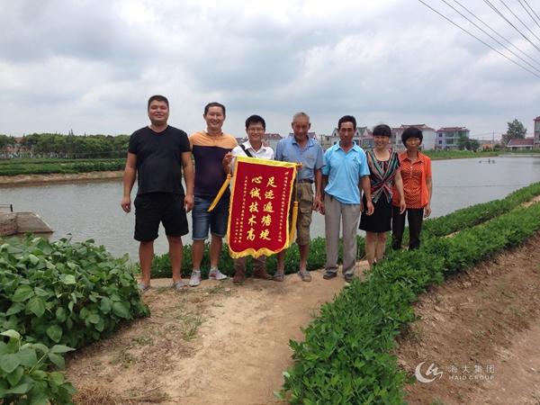8月11日一大早,上海市浦東新區龍港村養殖戶(hù)劉龍標、康德官、陳國忠、陳國民四人將一面寫(xiě)有“足跡遍塘埂,心誠技術(shù)高”的大紅錦旗送到了南通海大技術(shù)服務(wù)員李義鵬的手中,衷心感謝李義鵬連續兩年來(lái)在養殖上給予他們精心的指導和服務(wù),服務(wù)型經(jīng)銷(xiāo)商王海波和公司領(lǐng)導高平見(jiàn)證了這溫馨的一幕。