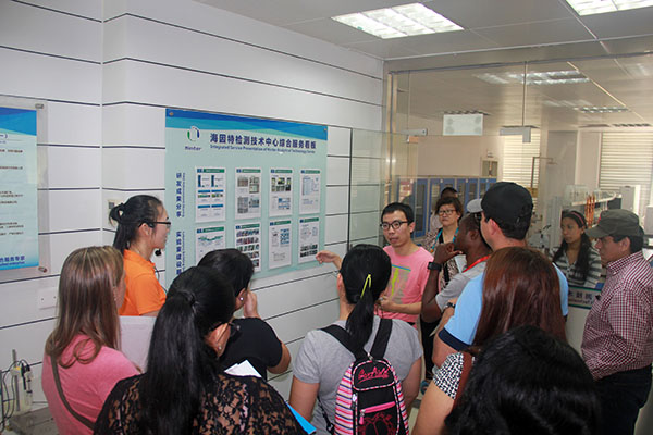 研修班的37名官員,來(lái)自于拉美及加勒比國家的海洋漁業(yè)、海岸帶、海洋環(huán)境、海洋經(jīng)濟、海洋科技以及國際運輸等領(lǐng)域。在海因特團隊的陪同下,先后參觀(guān)了海因特檢測技術(shù)研發(fā)中心、生產(chǎn)車(chē)間、辦公區等。海因特國際部專(zhuān)員全程介紹了公司的產(chǎn)品研發(fā)、品質(zhì)保障、生產(chǎn)現狀、管理模式、銷(xiāo)售區域等情況,高標準的檢測技術(shù)研發(fā)中心以及干凈整潔的生產(chǎn)車(chē)間和辦公區域給外賓們留下了深刻的印象。