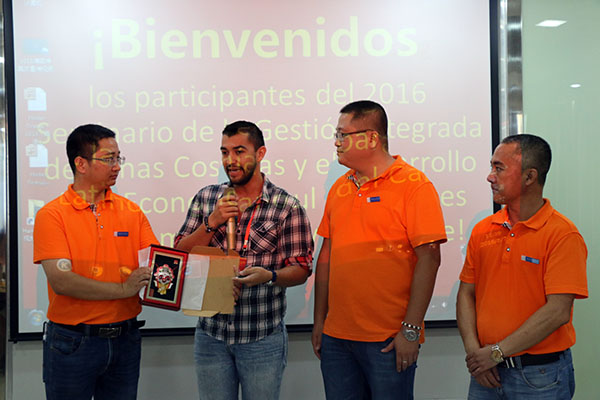 2016年8月7日上午,由中國商務(wù)部主辦、福建海洋研究所承辦的“2016拉美及加勒比國家海岸帶綜合管理與藍色經(jīng)濟發(fā)展官員研修班”(以下簡(jiǎn)稱(chēng)“研修班”),在福建海洋研究所梁紅星所長(cháng)的帶隊領(lǐng)導下,蒞臨海因特集團參觀(guān)交流。海因特集團海外大區總監蘇適、技術(shù)部薛繼鵬博士、總經(jīng)理助理張文烽等代表海因特集團對官員們的來(lái)訪(fǎng)表示熱烈歡迎,并帶領(lǐng)海因特團隊熱情接待了客人。
